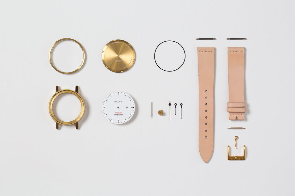 The watch’s matte black hands make for a soft contrast against the bone white dial, while the subtle use of red adds a quiet graphical element to the watch. Another defining detail to this design is the Swiss vegetable tanned leather which is sure to age beautifully into a dark brown over time. The stainless steel gold case measures 38mm in diameter and houses a Japanese quartz movement.